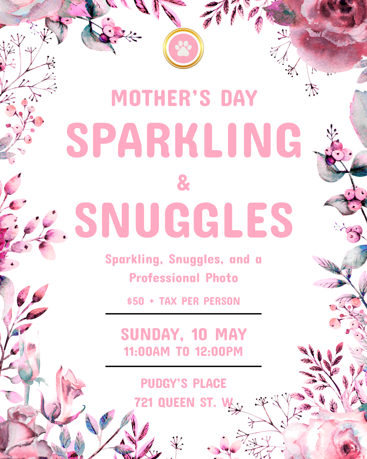 Bubbles, Cuddles, and a moment you can take with you. Join us Sunday May 10th 11am-12pm for a Mother's Day event you won't want to miss. Cuddle with Rescue pups while you sip on something sparkling. Once you know who your favourite puppy is, Snout Studio will take a pic you can take home with you!